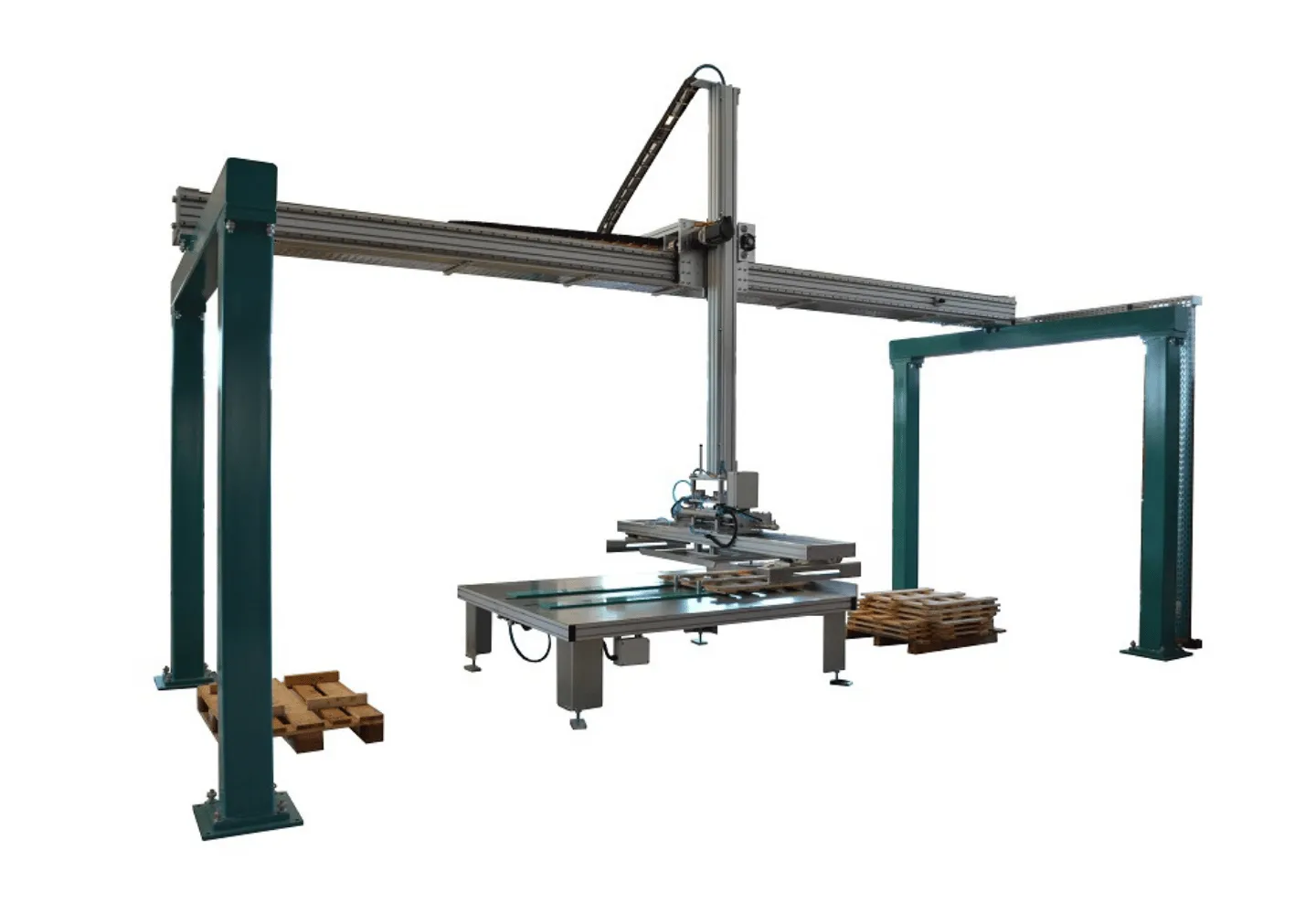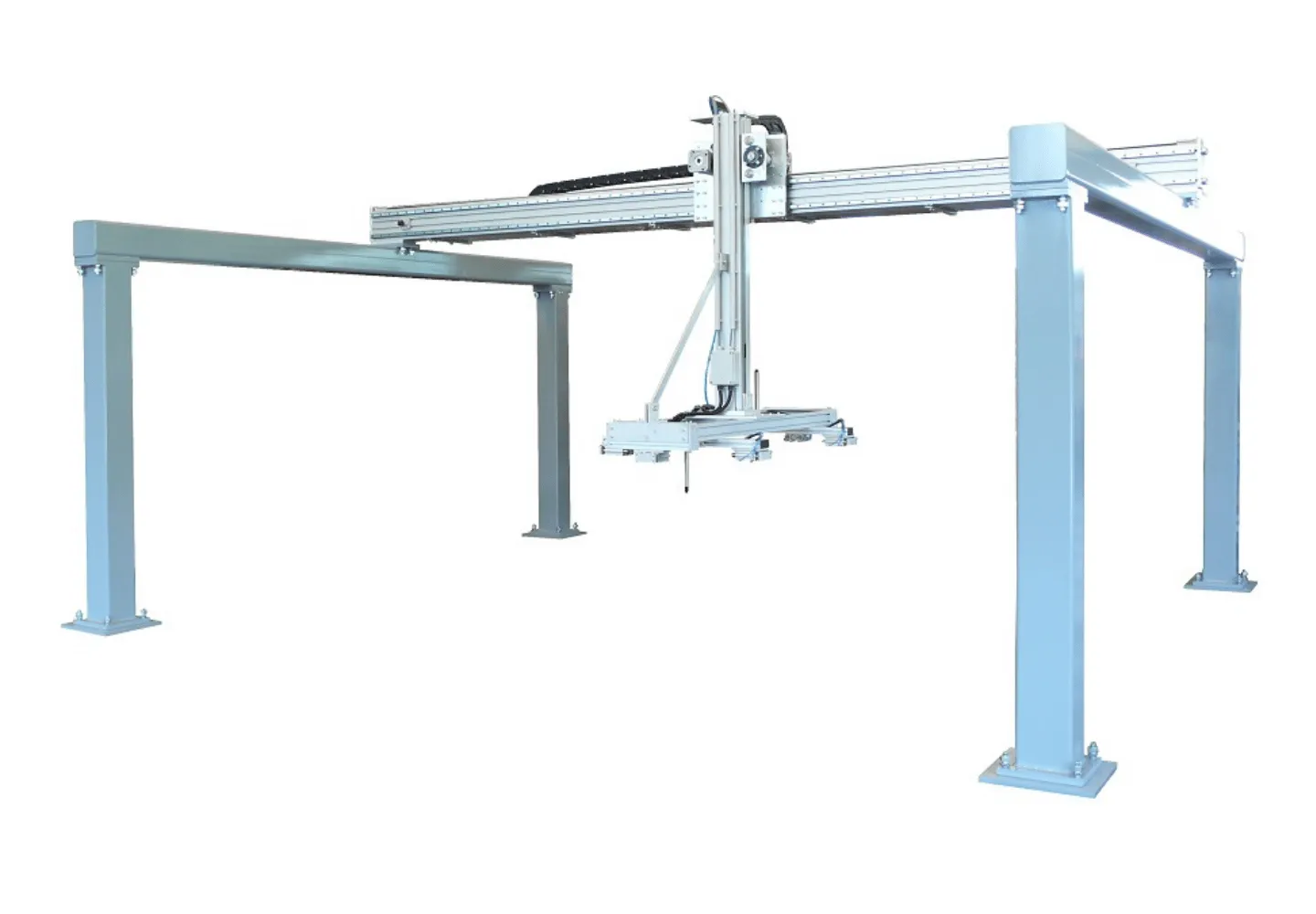 Robot a portale di taglia-medio grande (da 50kg a 1000Kg al polso) con due assi per il movimento orizzontale e verticale e la possibilità di aggiungere ulteriori assi per la rotazione e/o il brandeggio della pinza.